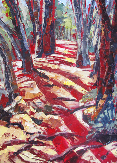 Her work is an emotional response to the subject, theme and environment she finds herself in. Her intention is to capture the immediacy of the moment and the experience of it by utilisilising surfaces and materials at hand.